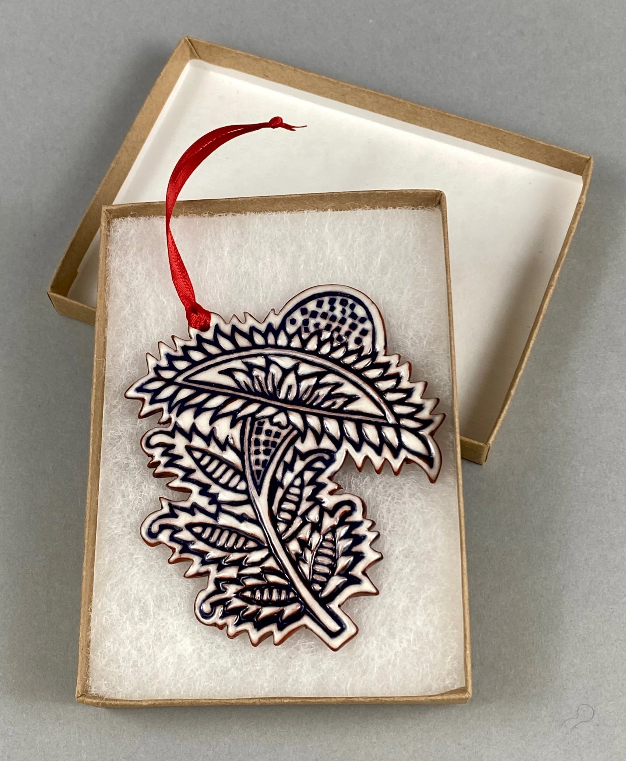 Vintage textile blocks have been pressed onto the clay to fashion theses unique ornaments. Each slab of printed clay is then painstakingly cut to remove all excess from the graphic. Once dry, the varied motifs are painted with colorful underglazes or with a single color to bring the design to life. On a tree or in a window these distinct objects are a visual delight.