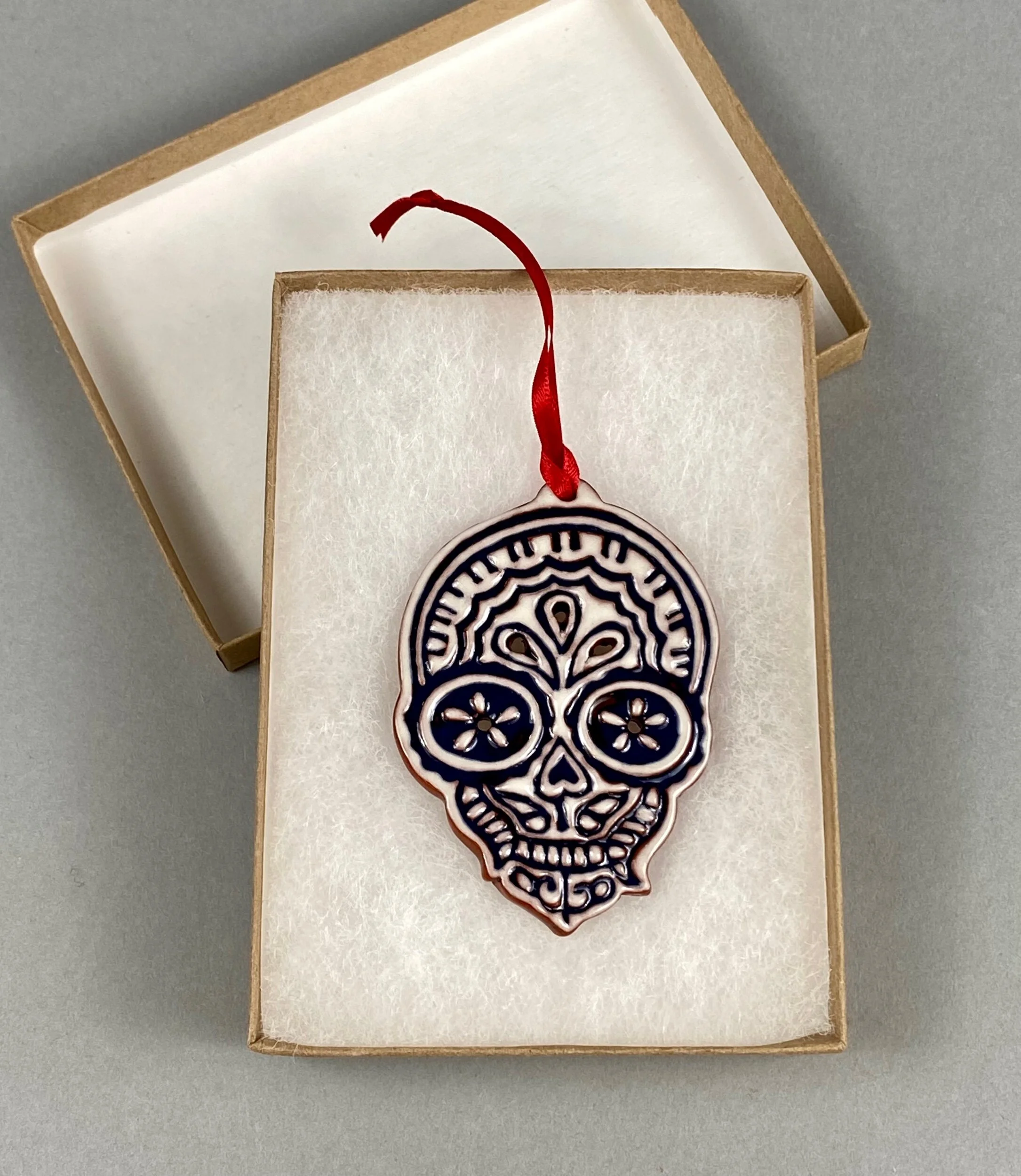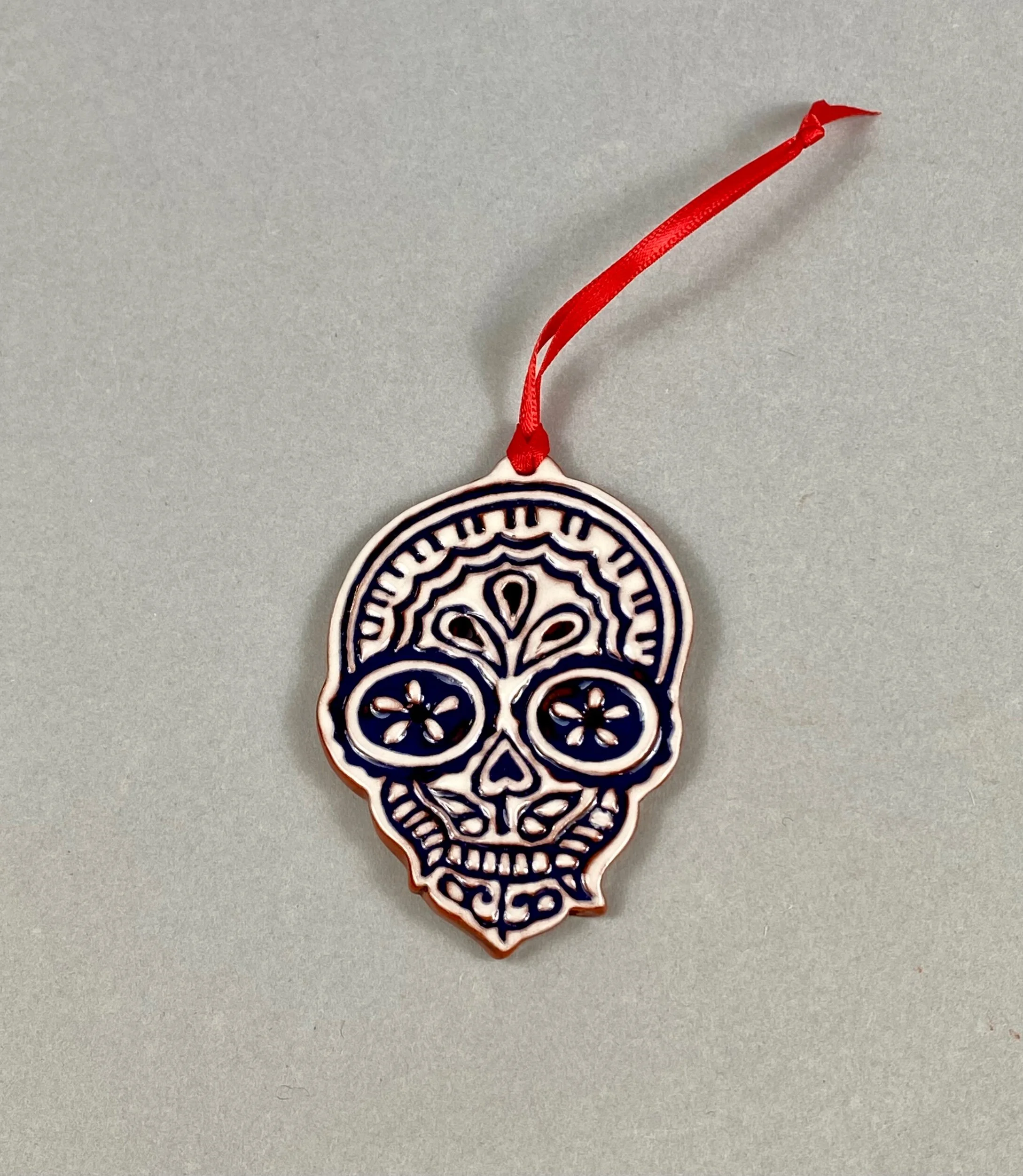 Vintage textile blocks have been pressed onto the clay to fashion theses unique ornaments. Each slab of printed clay is then painstakingly cut to remove all excess from the graphic. Once dry, the varied motifs are painted with colorful underglazes or with a single color to bring the design to life. On a tree or in a window these distinct objects are a visual delight.