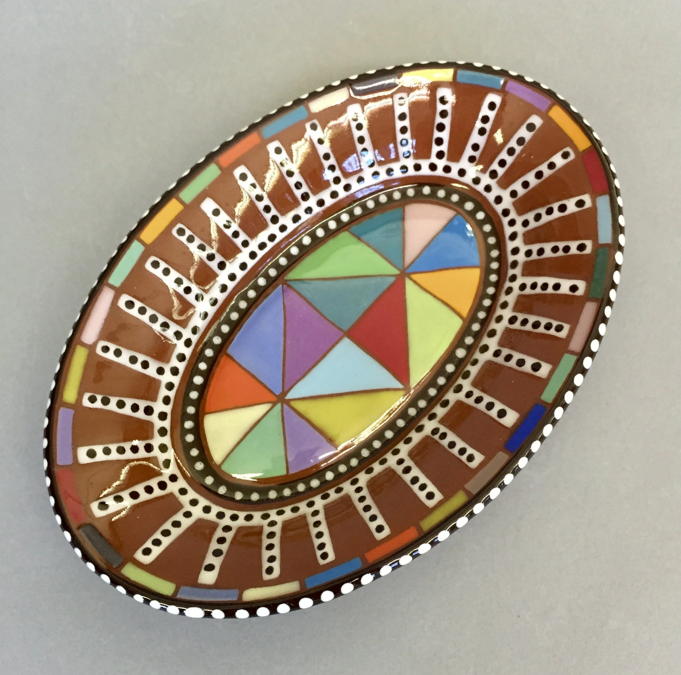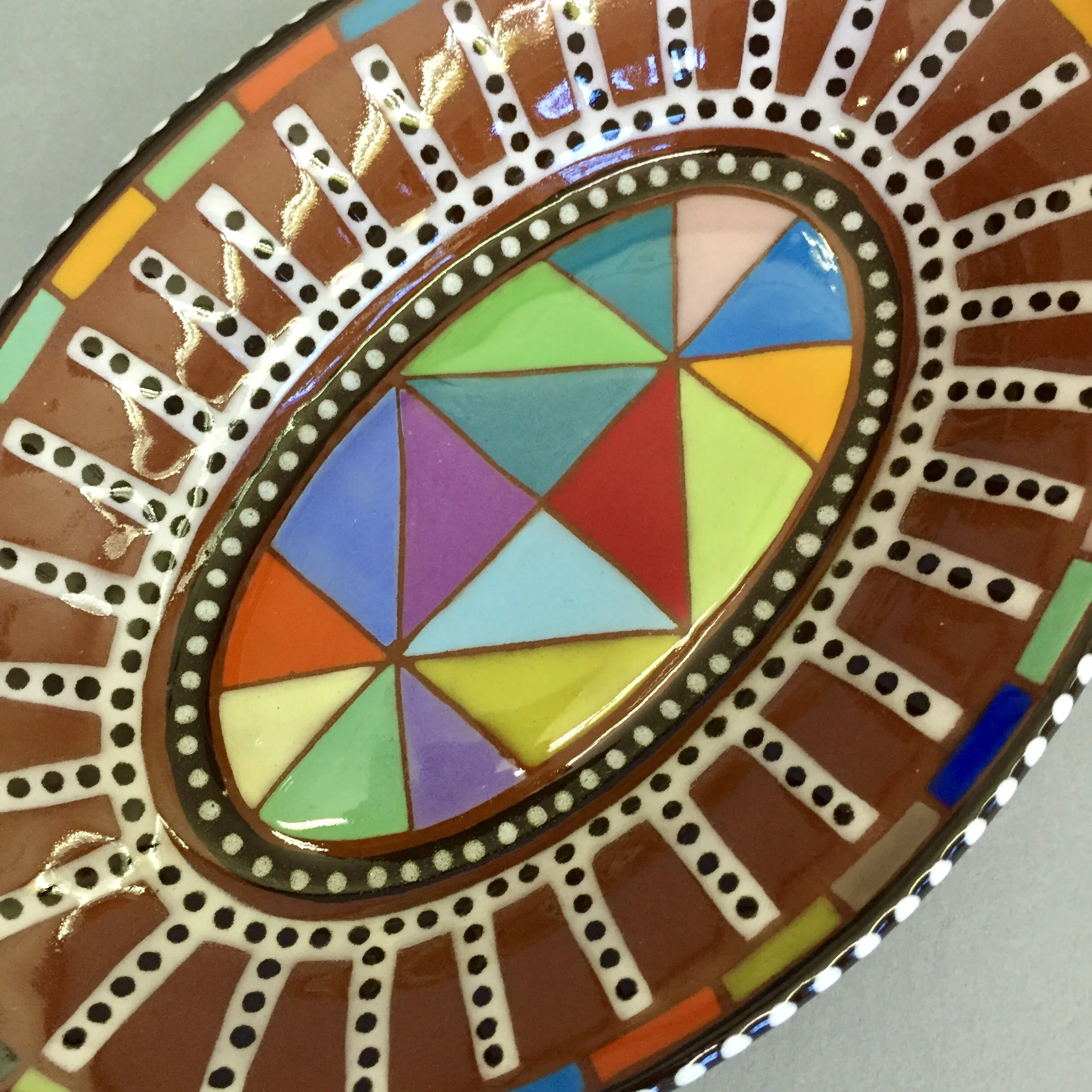 This one of a kind terracotta vessel is hand made and painted by the artist in her Warren, RI studio. It is food safe and fully functional. Dishwasher safe, hand wash preferred.