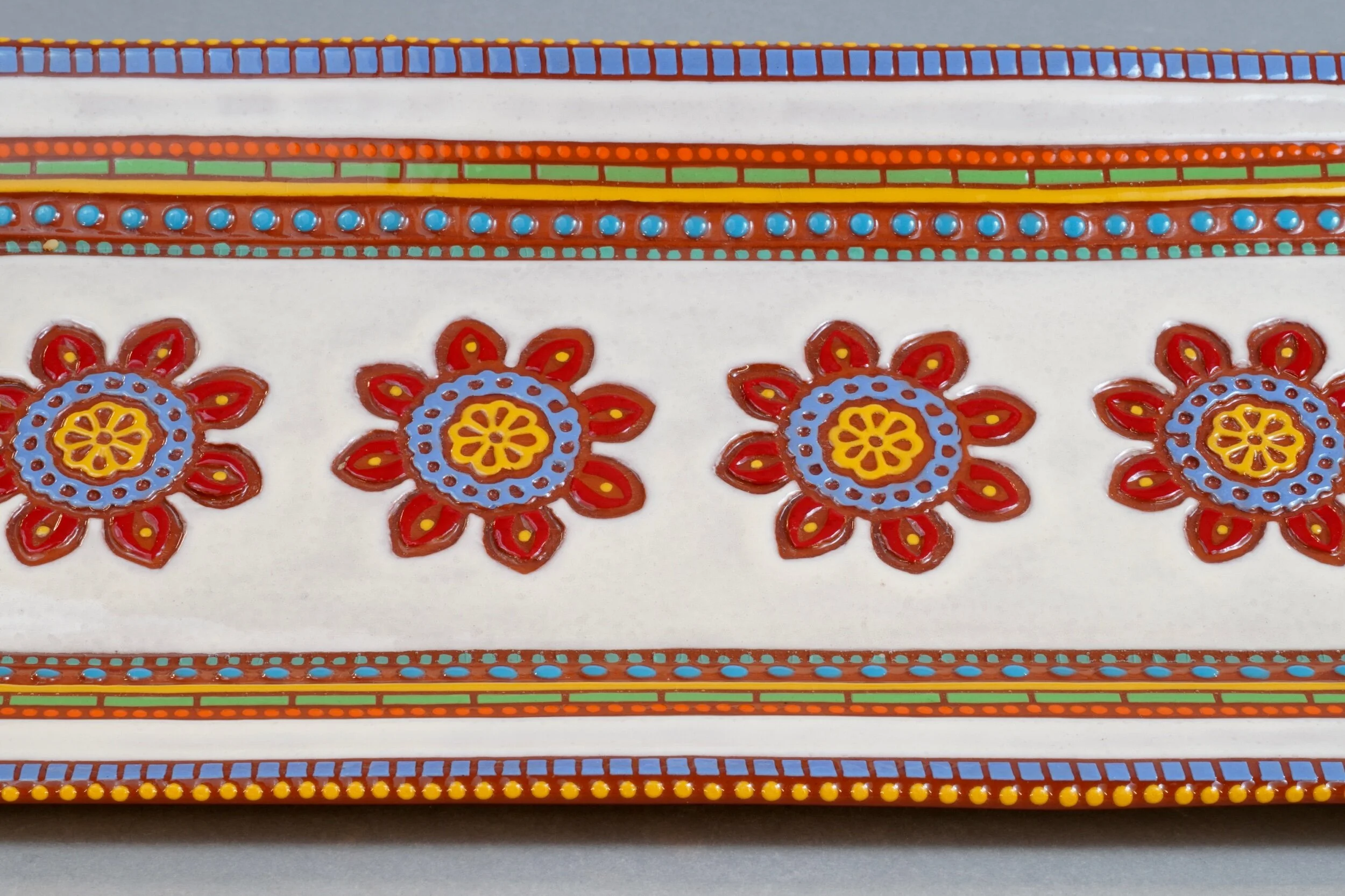 This graphic platter celebrates the daisy with it’s recessed designs embellished with a printed textile motif, then hand painted with colorful underglazes. Festive on your table or hanging as an objet d’art on your wall.