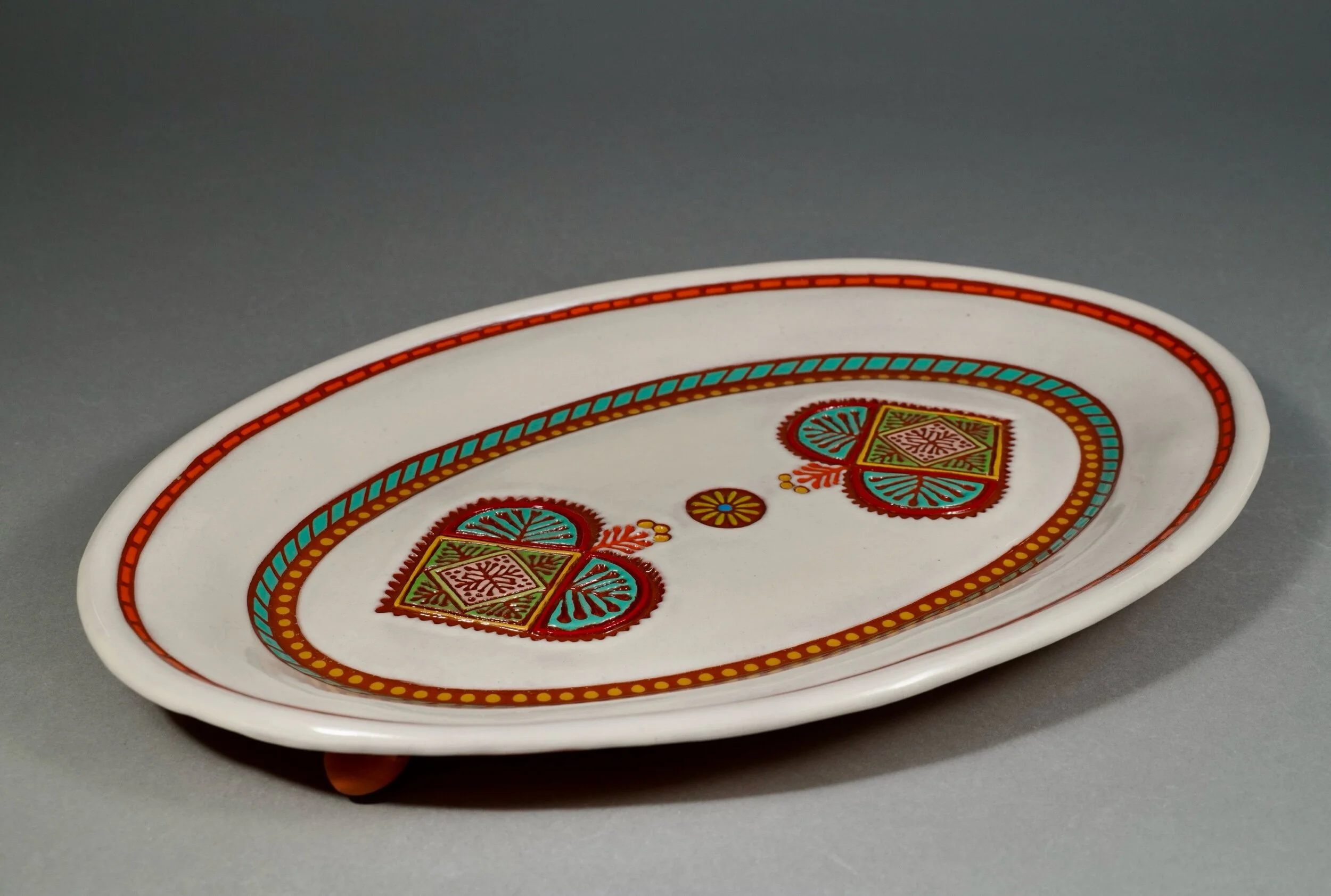 This graphic ovalplatter celebrates love with it’s recessed designs embellished with a printed textile motif, then hand painted with colorful underglazes. Festive on your table or hanging as an objet d’art on your wall.