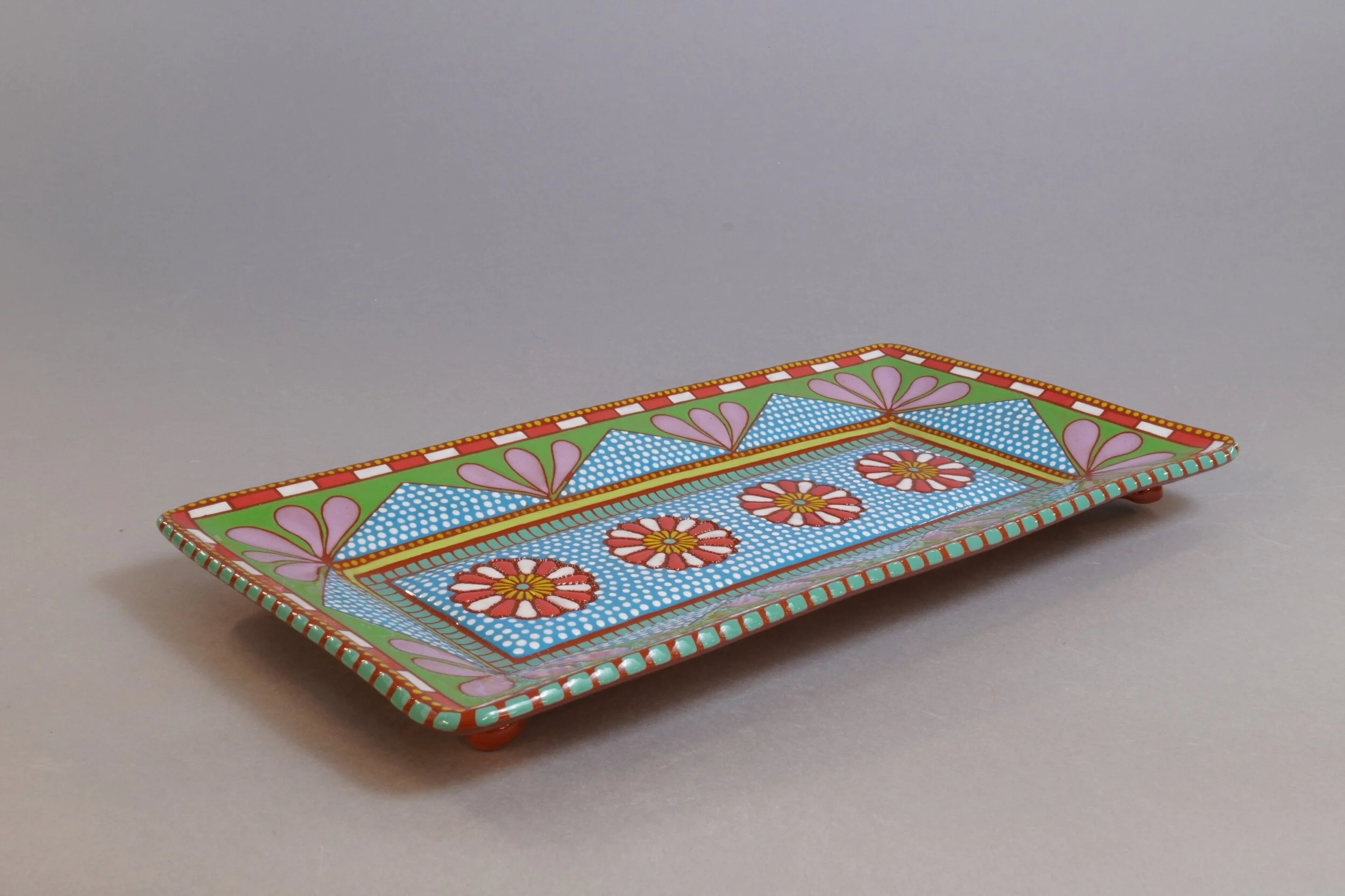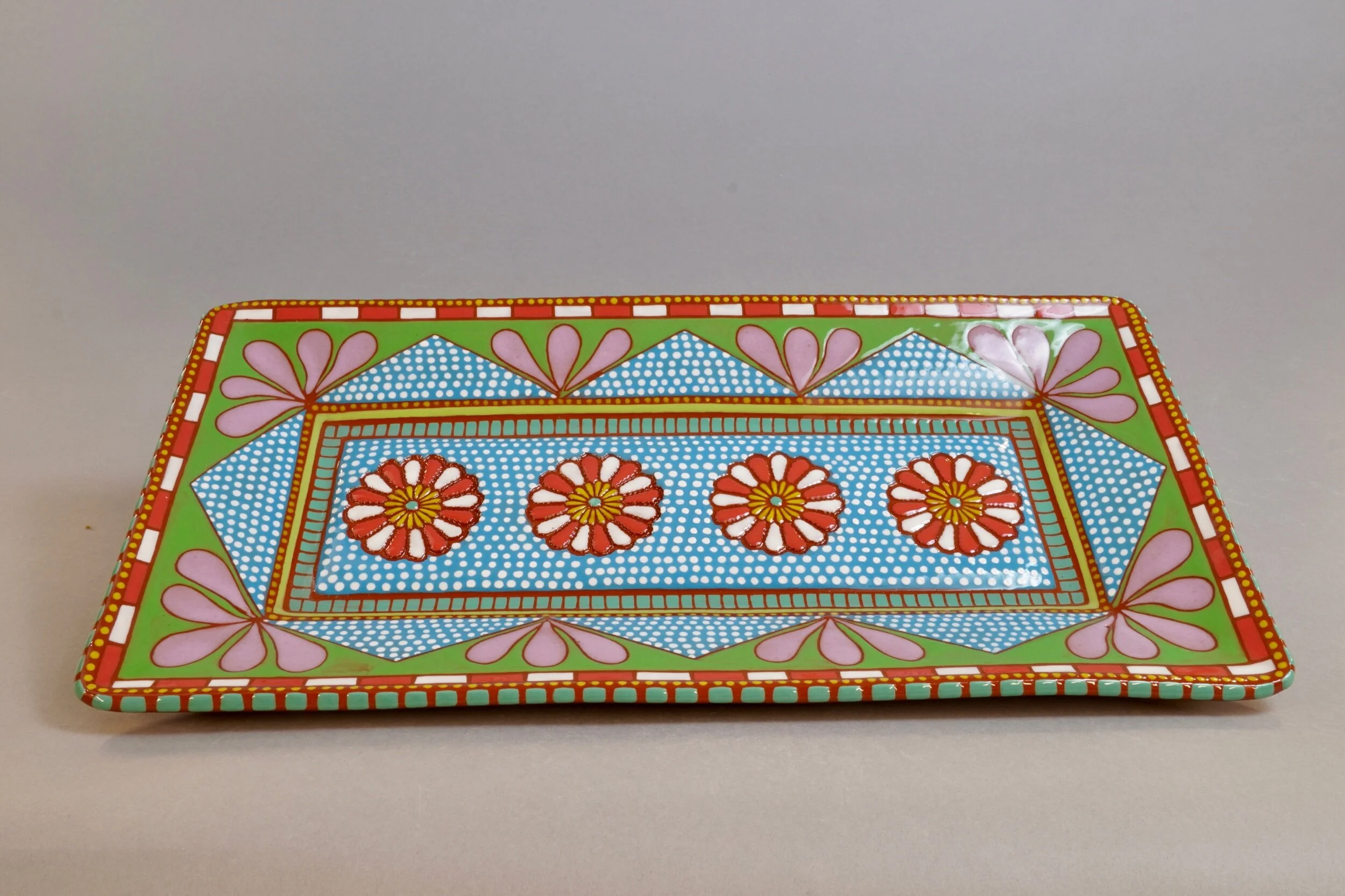 Poinsettia is an eye catching ceramic graphic, as much a painting as a platter. Her exterior attachments allow for hanging on your wall when not in use celebrating your culinary creation.