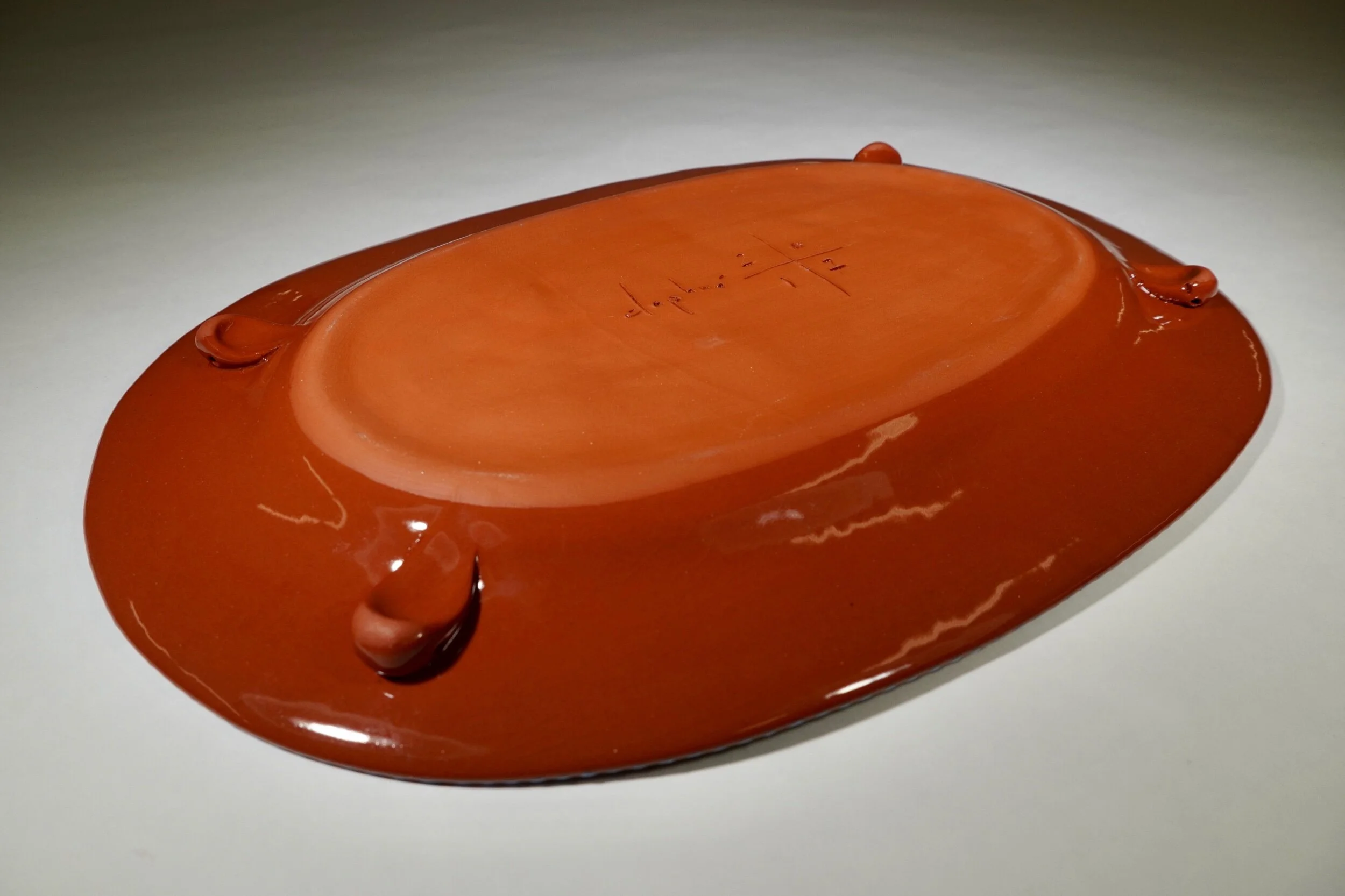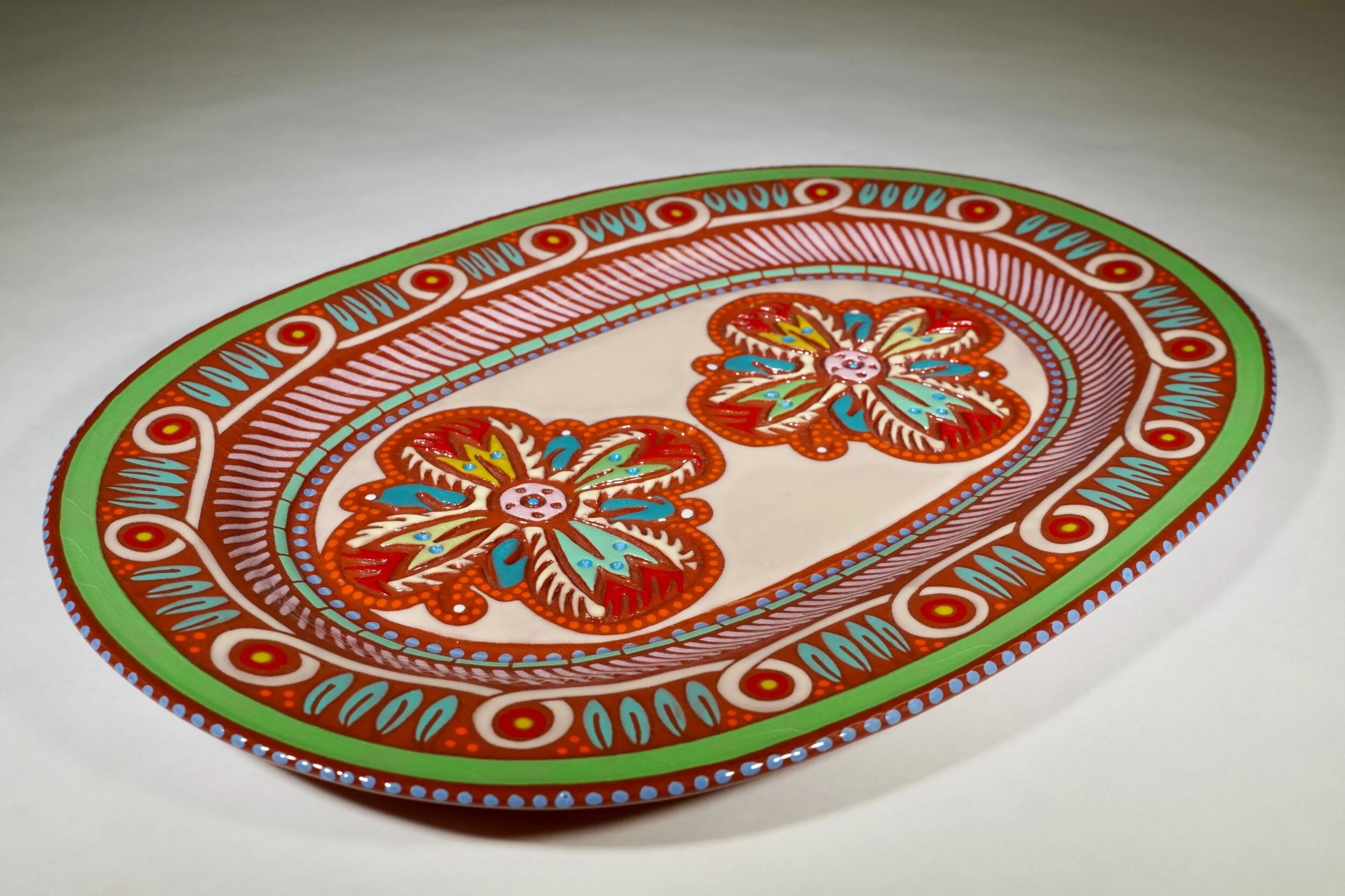 Bring the garden into your home with this graphic oval platter. Green Gable is embellished with a recessed floral motif then hand painted with colorful underglazes that bring the graphic to life. A stunner on your table or hanging from your wall as a ceramic objet d’art.