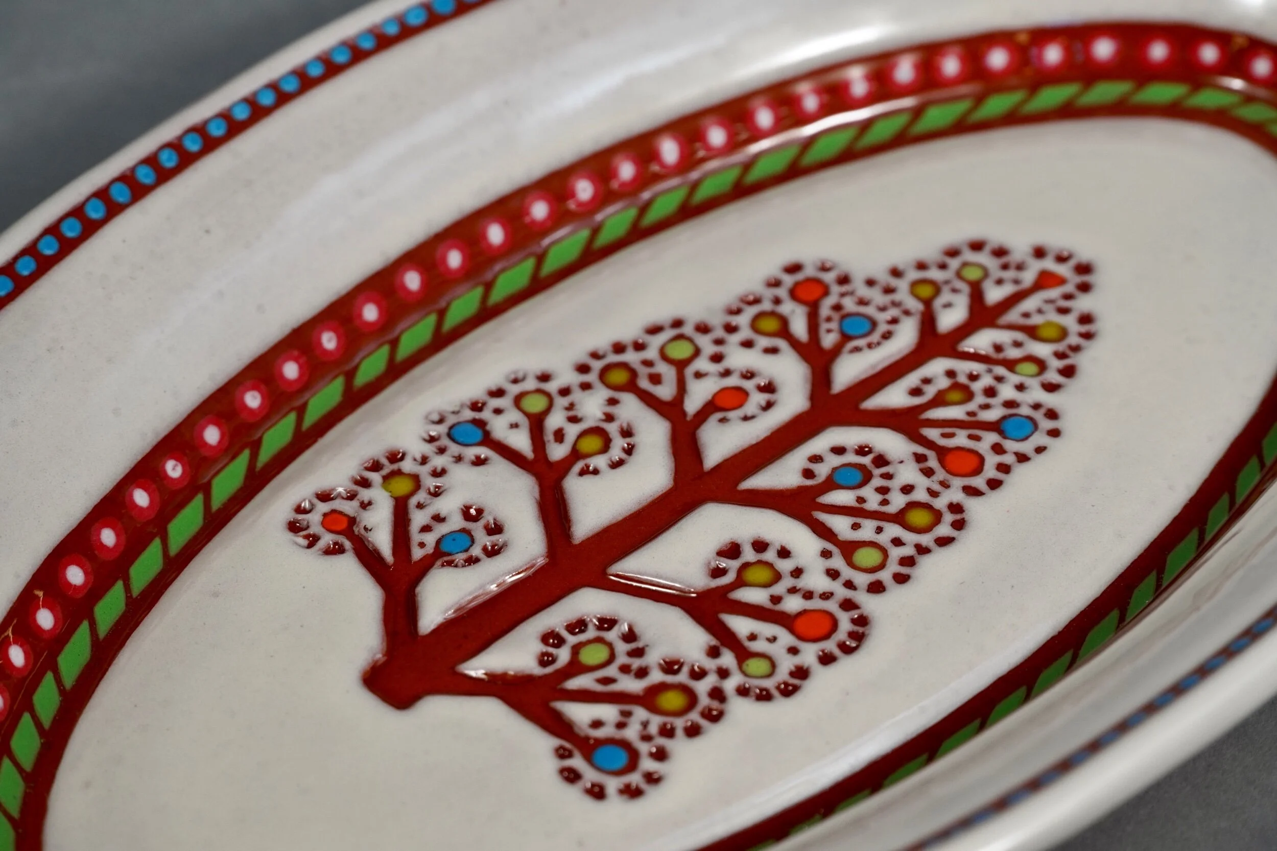 Ribbon Candy anyone? This graceful oval dish celebrates the season with it’s soft white background and color accented tree. It is the perfect side dish for grilled asparagus or any veggie, not just ribbon candy.