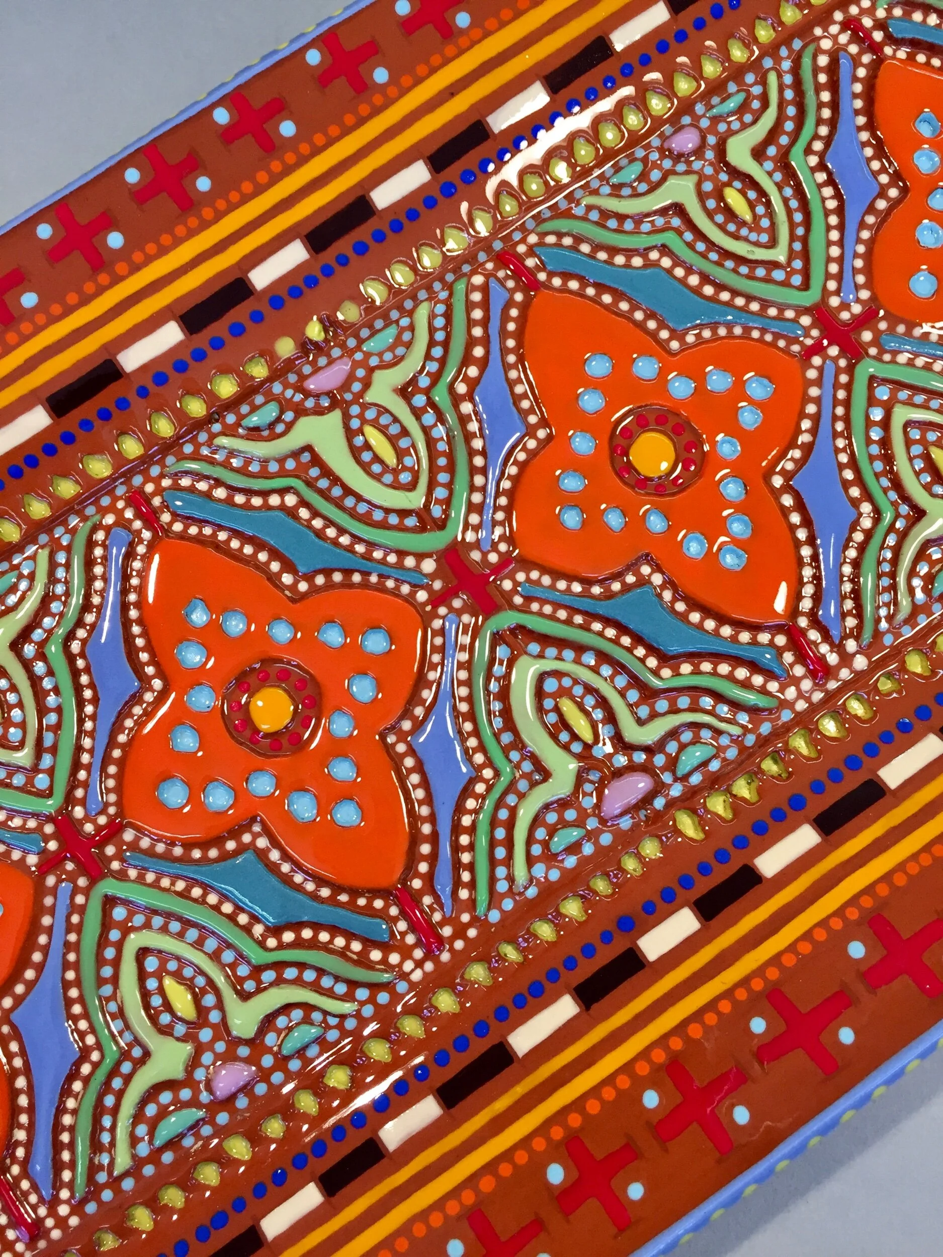 This memorable platter is embellished with a recessed, printed textile motif then hand painted with colorful underglazes to highlight the rich graphic design. Exterior attachments allow this fully functional platter to hang on your wall as a ceramic painting.