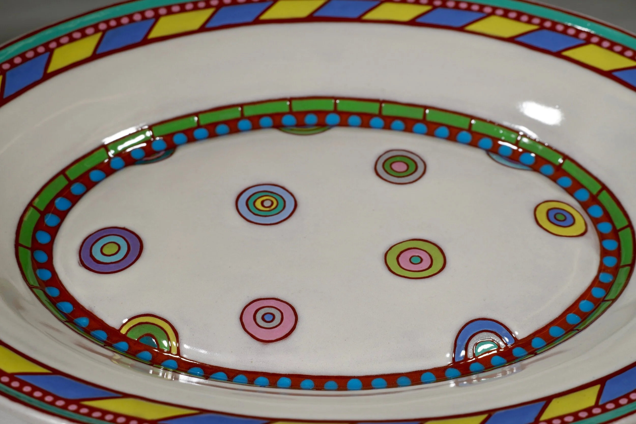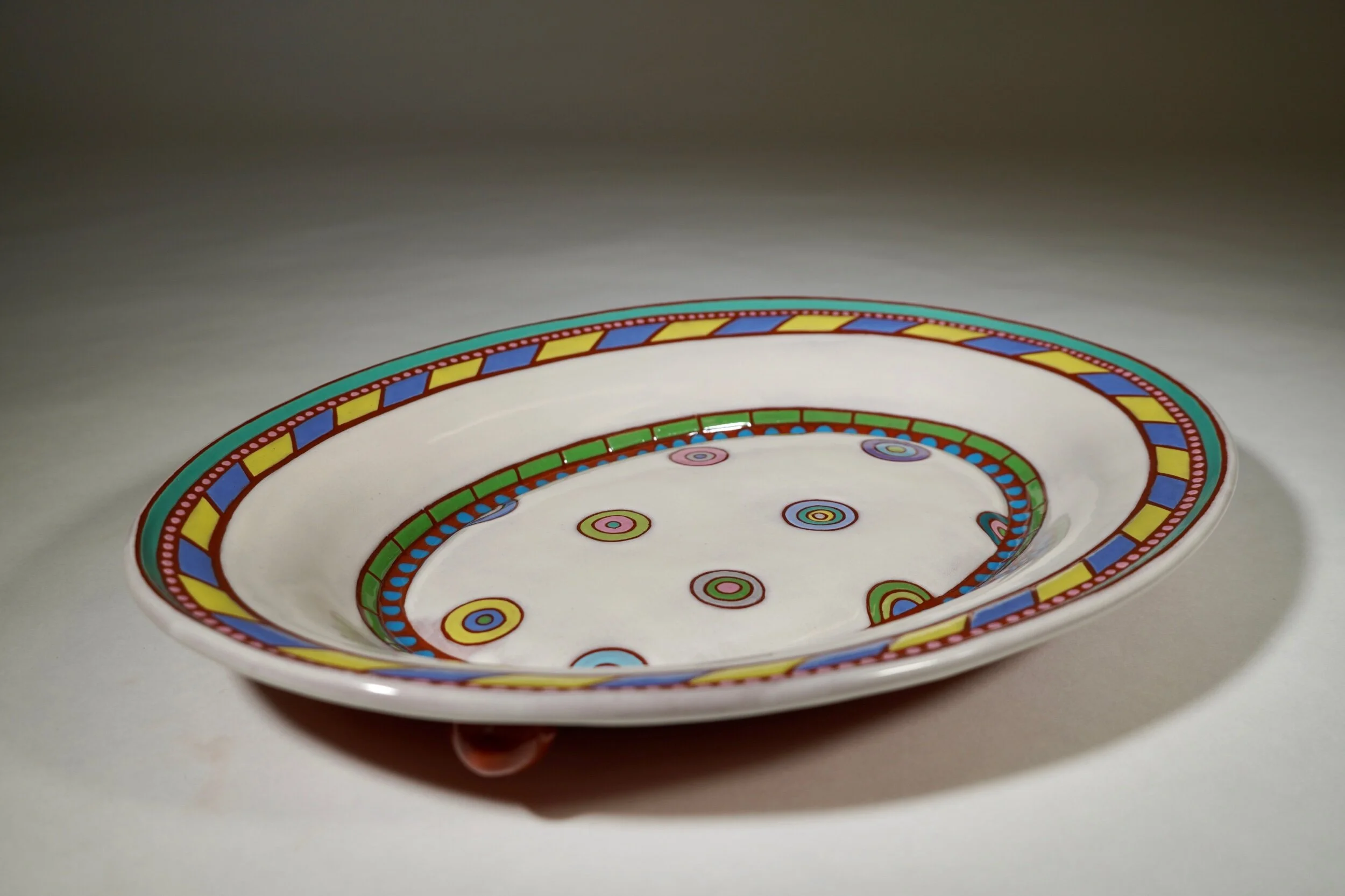 A celestial motif on a neutral soft white sea ready to celebrate your food of choice. This oval platter fully functional as a pot can also hang as a ceramic graphic art piece on your wall with built in attachments.