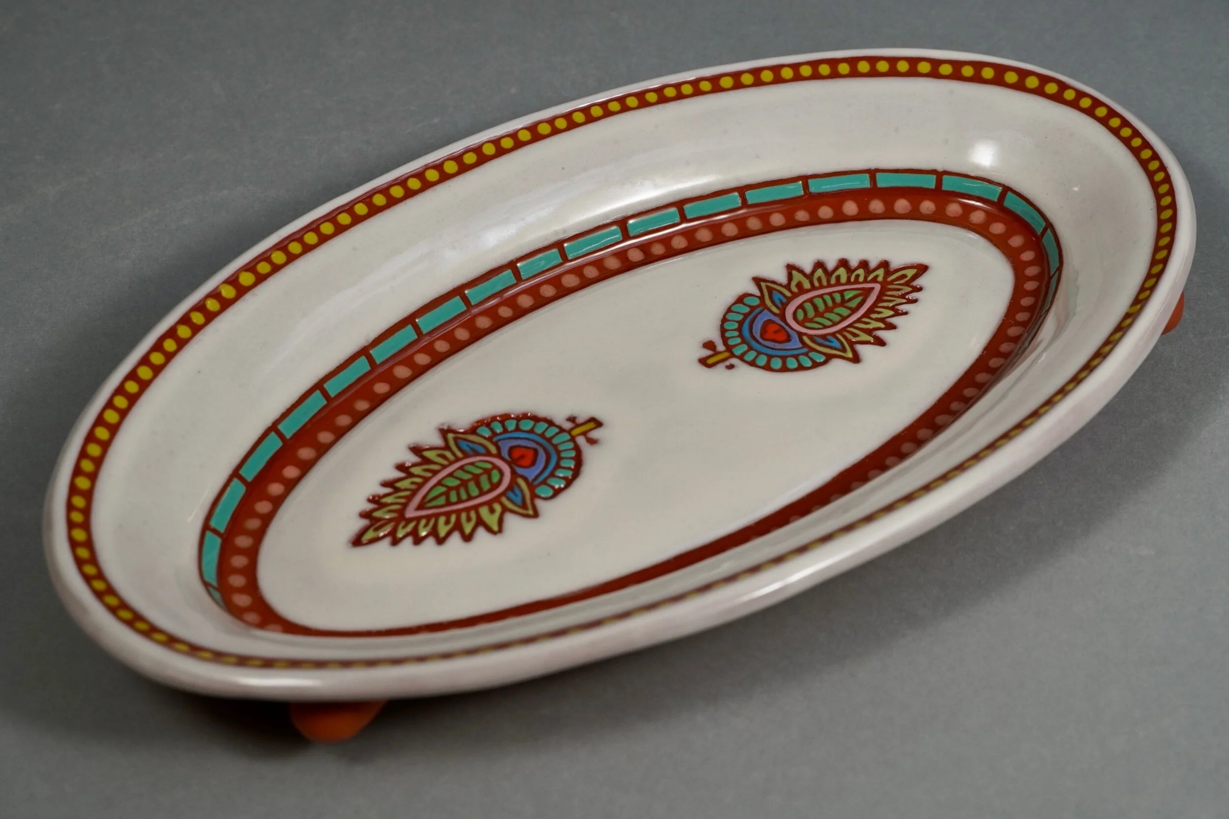 Grilled asparagus, Sushi? Tea Leaves is ideal for displaying your culinary side dish with flair. This shallow oval dish makes a perfect hostess gift! Exterior attachments allow this piece to hang as a ceramic objet d’art when not highlighting your favorite food.