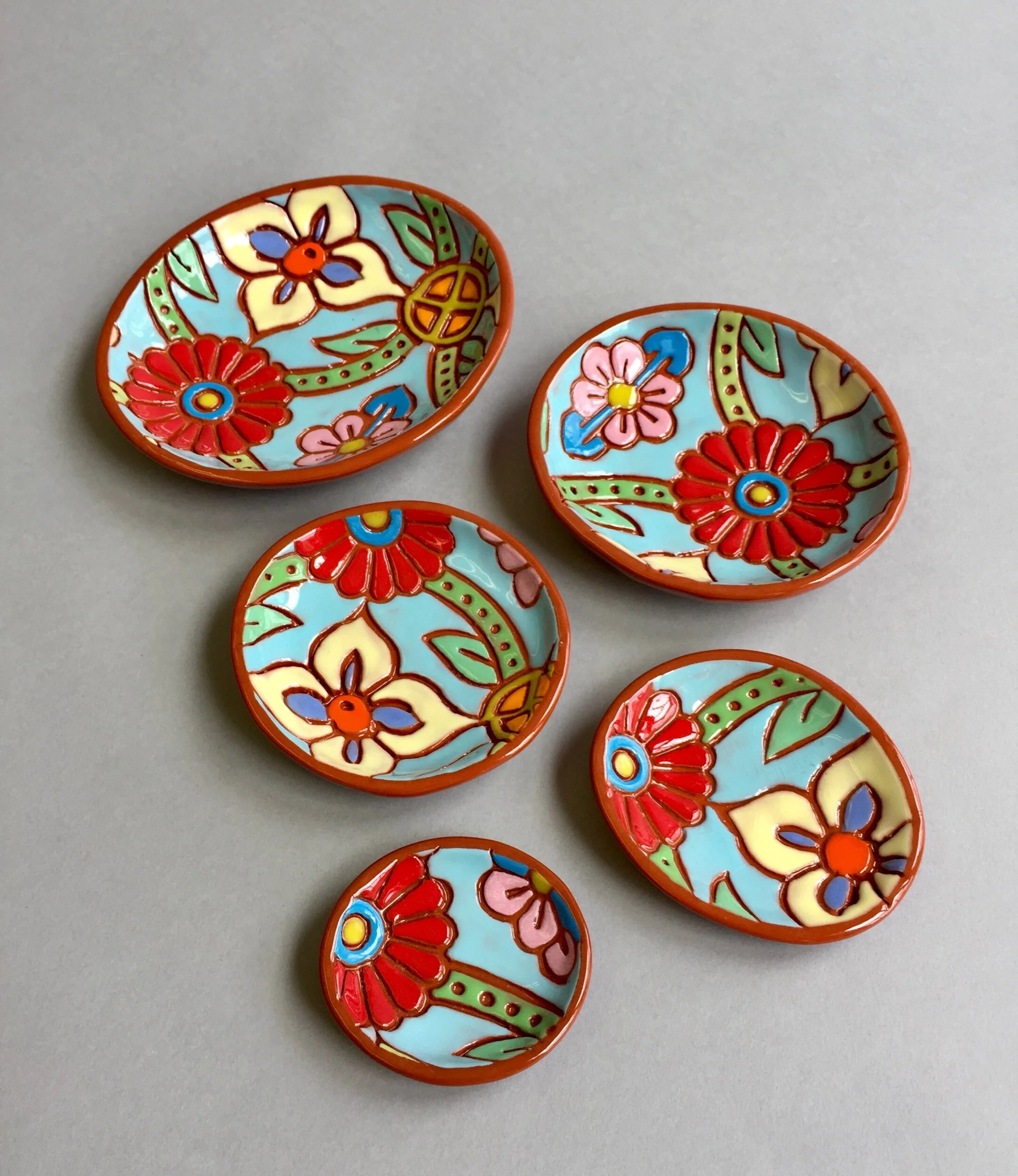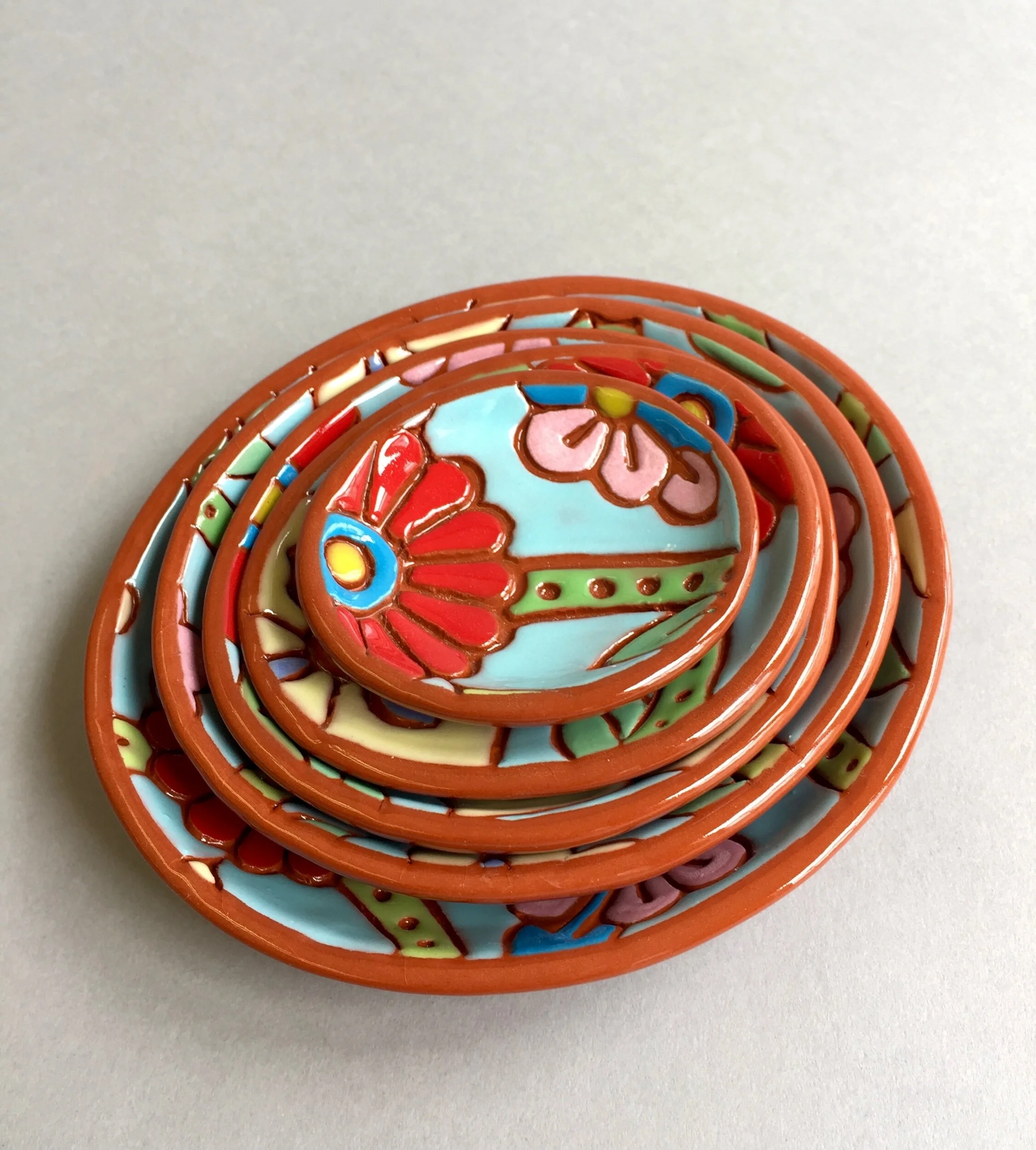 ‘Red Daisy/Summer Sky’ is comprised of 5 terra-cotta nesting Rock-pots cast from Block Island beach rocks then embossed with vintage Indian Textile blocks. Each unique motif comes to life painted by hand with colorful underglazes. All are food and dishwasher safe although hand wash is preferable. The ideal gift for Tapas, trinkets or treasure.