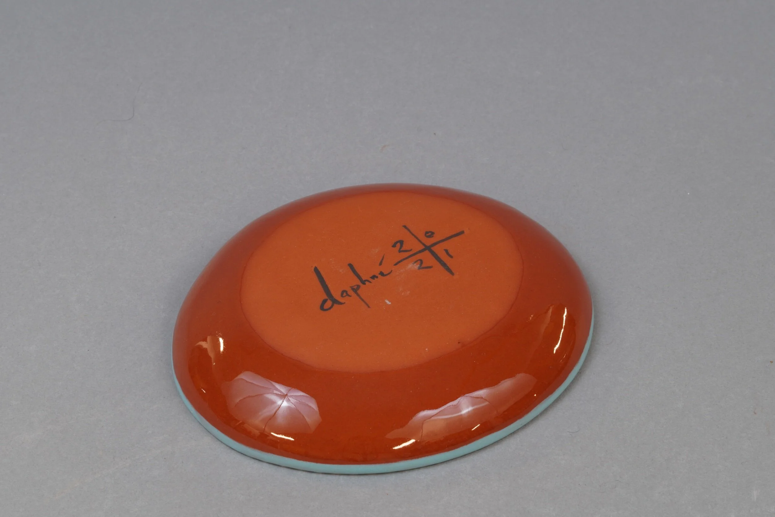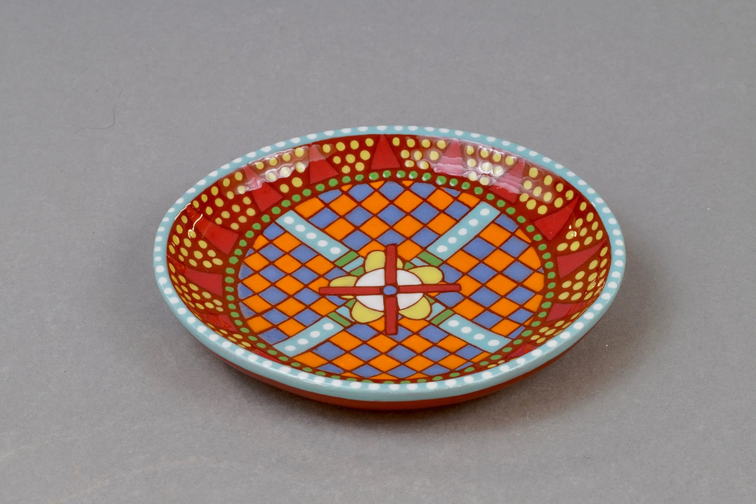 ‘Mosaic Cross’ with it’s rich graphic, comes alive on the terra-cotta base. The colorful motif painstakingly painted by hand with colorful underglazes presents as a gem in any environment. Ideal for tapas, trinkets or treasure.