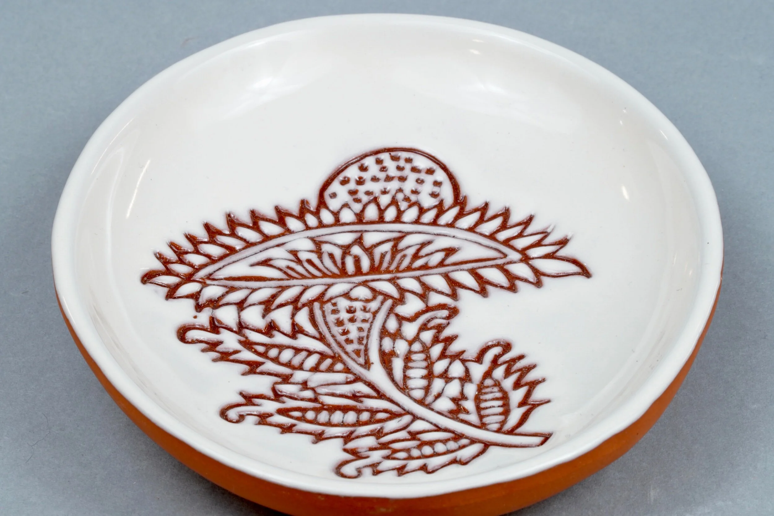 ‘White Teasel’ with it’s incised graphic, comes alive on the terra-cotta base. The off white background quietly highlights the pressed motif for more of a ‘zen’ gem. Ideal for tapas, trinkets or treasure.