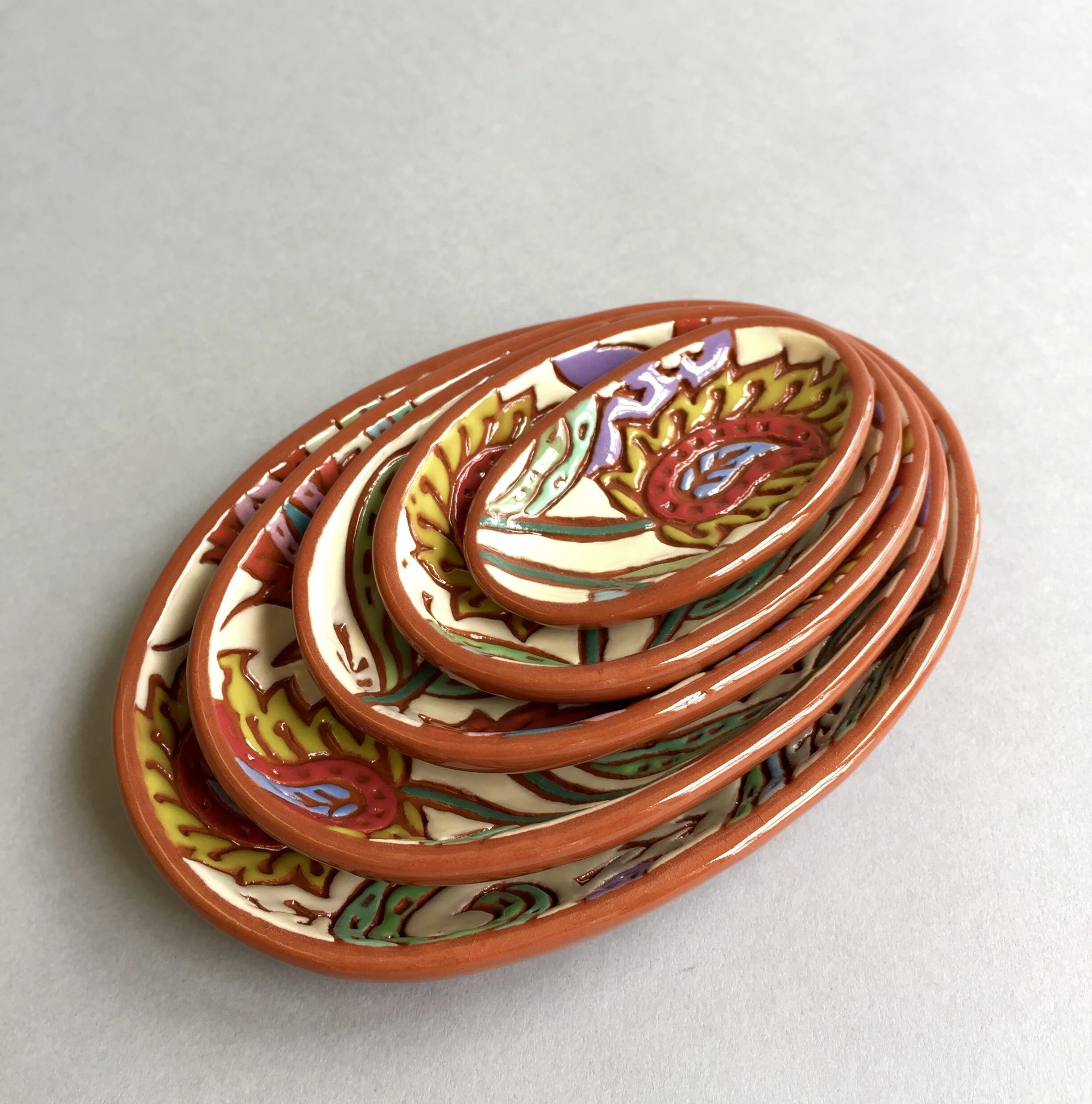 ‘Vanilla Paisley’ is comprised of 5 terra-cotta nesting Rock-pots cast from Block Island beach rocks then embossed with vintage Indian Textile blocks. Each unique motif comes to life painted by hand with colorful underglazes. All are food and dishwasher safe although hand wash is preferable. The ideal gift for Tapas, trinkets or treasure.
