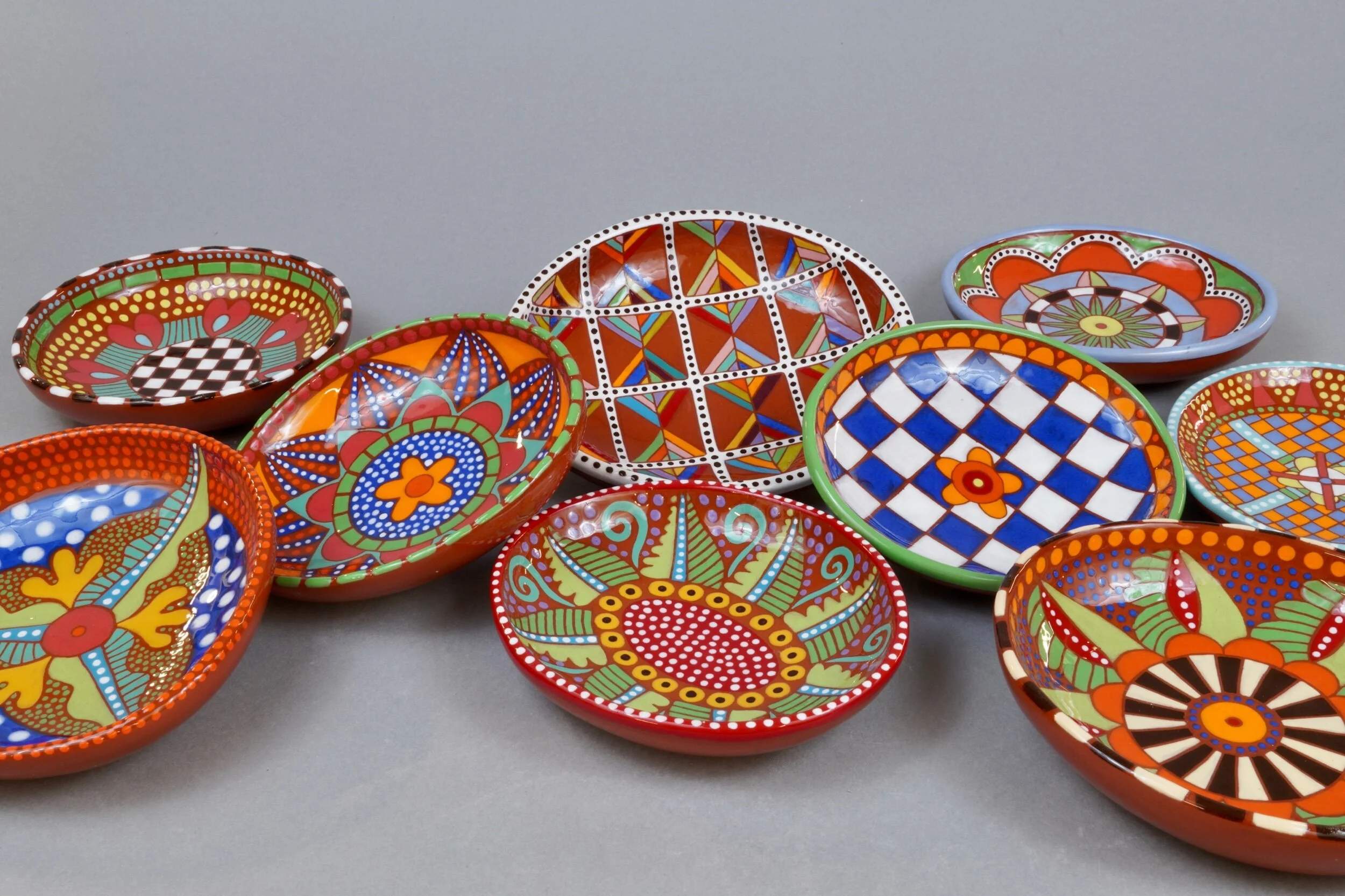 ‘Poppy II’ with it’s rich graphic, comes alive on the terra-cotta base. The colorful motif painstakingly painted by hand with colorful underglazes presents as a gem in any environment. Ideal for tapas, trinkets or treasure.