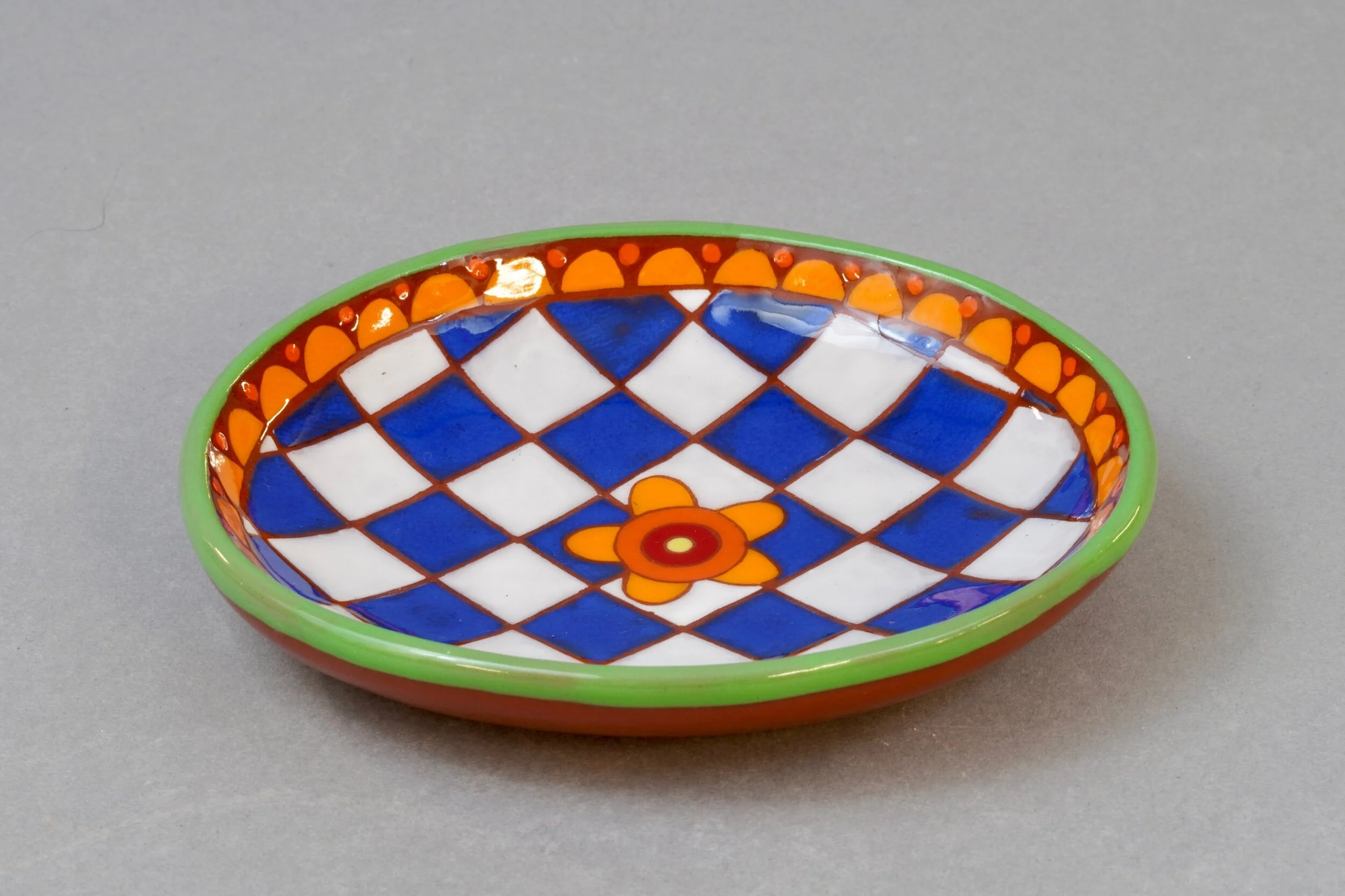 ‘Ibiza’ with it’s rich graphic comes alive on the terra-cotta base. The colorful motif painstakingly painted by hand with colorful underglazes presents as a gem in any environment. Ideal for tapas, trinkets or treasure.